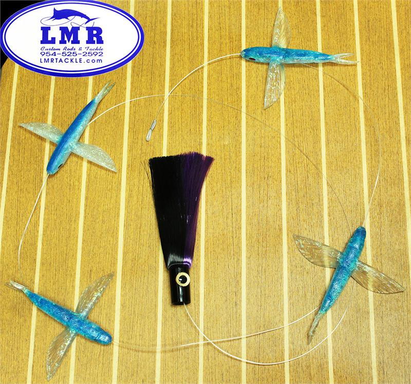 The Flying fish chain is one of the hottest daisy chains of the year. LMR Tackle hand makes each of these one at a time. We use 4 Flying fish with a Snap Swivel at the end securing a Iland Express Purple & Black. 9 Foot overall length. Either way these things are deadly.