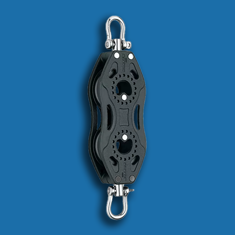 The # 2184 was designed to improve the deployment and retraction responsiveness and the precise presentation of bait teasers aboard sport fishing boats. The unit features two back-to-back 40 mm sheaves which make it symmetrical and balanced. This is the first fishing pulley with a swivel on both ends—where earlier models had a single swivel at the head. This eliminates the need to manually rig another swivel at the opposite end. Getting rigging done and lures in the water much faster. Symmetrical balanced and mated sheaves prevent the pulley from capsizing and improves load alignment. The pulley’s low friction design allows easier adjustment and movement of the teaser rig. This includes shaking grass and moving the rig in or out as the boat turns. Harken ball bearing technology helps crews react when there’s a fish on and everything else needs to come out of the water NOW.