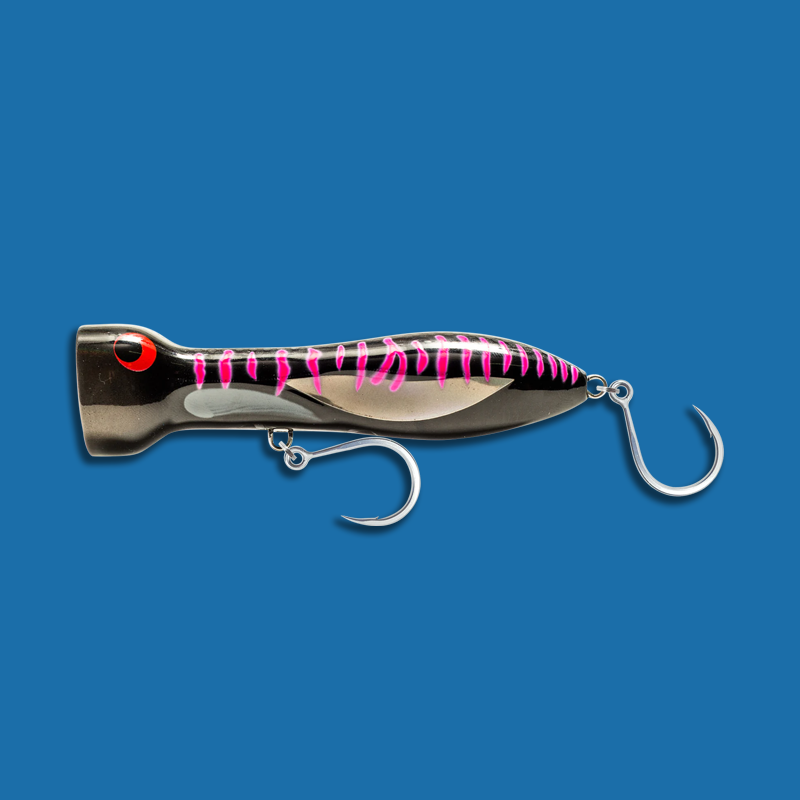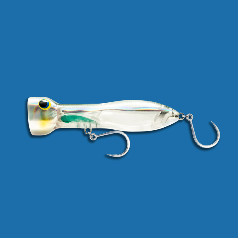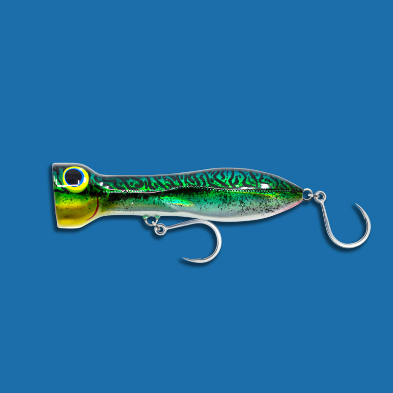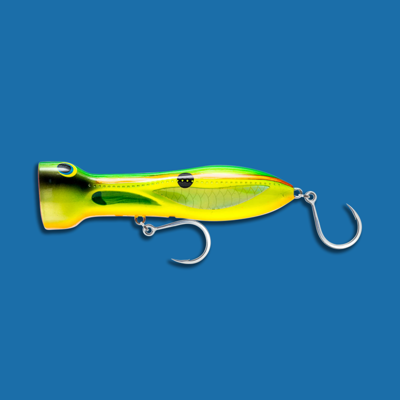 Simply put, the Chugg Norris is the ultimate popper. The Chugg Norris was designed around the concept of maximum action for minimum effort. Anyone who has thrown a big popper all day long for big pelagics offshore knows just how exhausting it can be. Years of experience in big popper fishing has led Nomad Design to create a lure in the ideal shape that not only excites fish, but is super easy to work. The ultra-deep cup face design is round at the bottom and square at the top in order to scoop up as much water as possible and send it high into the air, showering water back down in a wide range for the ultimate surface commotion. The Chugg Norris is constructed with a thick outer shell of HD ABS plastic surrounding its Gorilla Through Wire system, and is then filled with foam for ultimate strength and durability. Throw in super strong split rings and BKK inline or treble hooks and this popper may just be tougher than the guy it was named after.