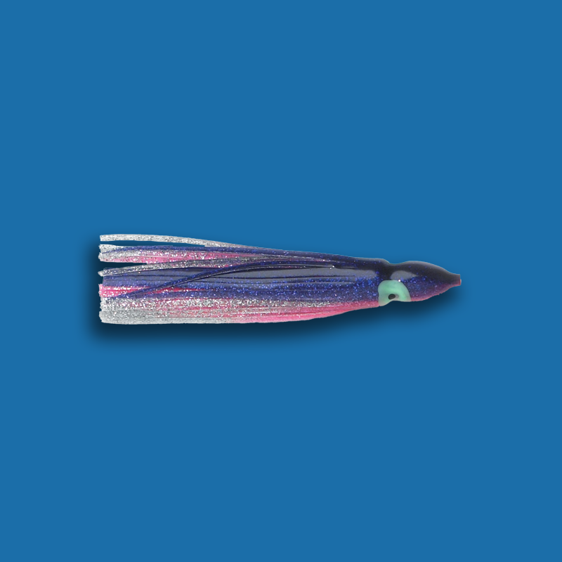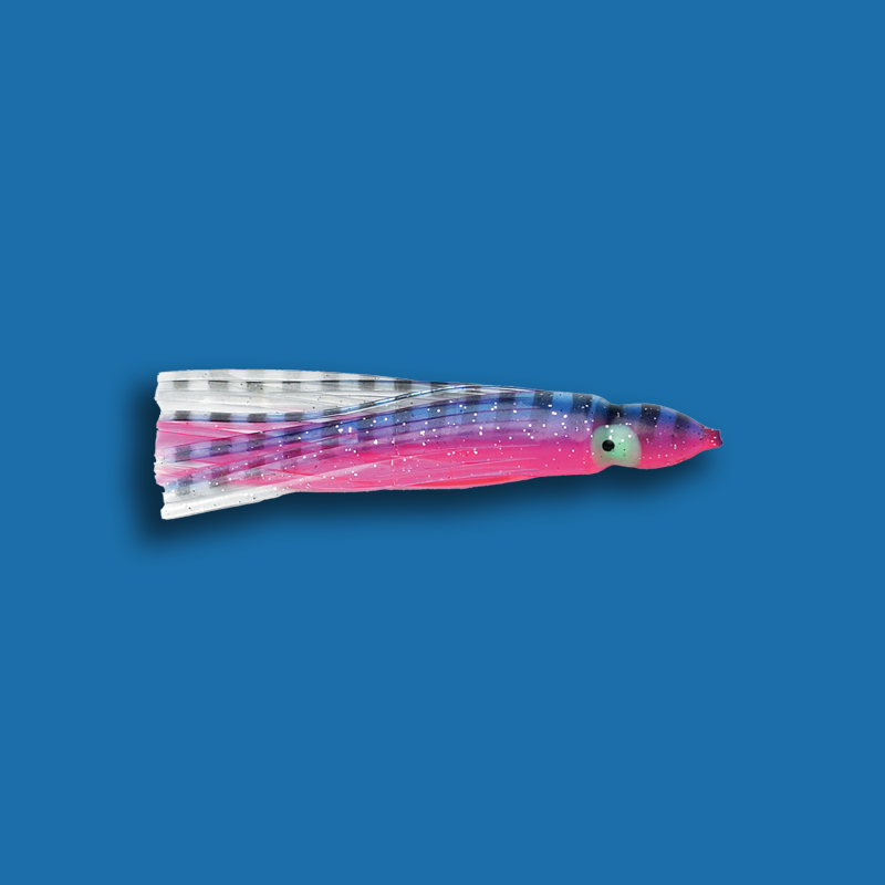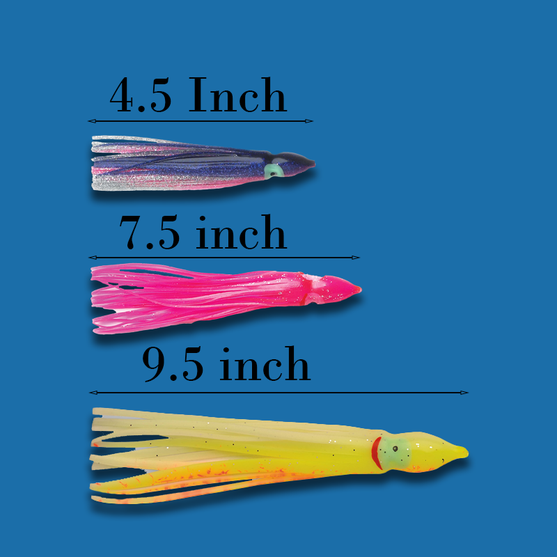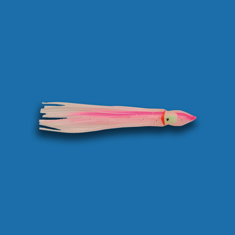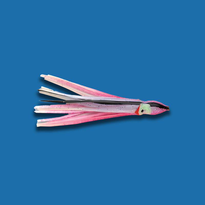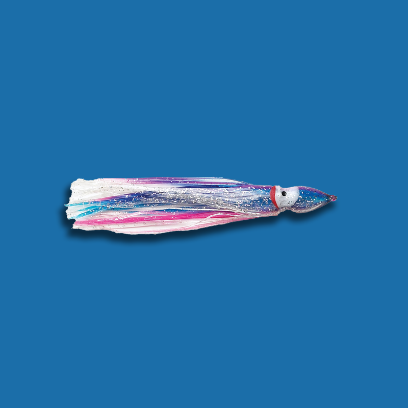 The P-Line Sunrise Squid is the perfect bait for a number of different species. From ocean salmon trollers using the 4.5 inch size, to albacore fishermen rigging the 7.5 inch models in “Daisy Chains”, to marlin fishermen re-skirting their favorite heads with the larger skirts.