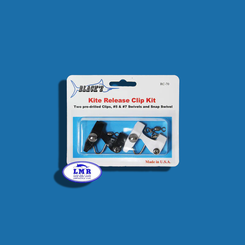 Blacks 's Marine Double Kite Release Clip Kit. Two pre-drilled Clips, #5 & #7 Swivels and Snap Swivel. This is referred to as the Black Marine Double Kite Clip kit with swivels. Each clip has a different sized hole for the swivel to catch on. Two Different colors for easy identification of each clip while on the kite line.