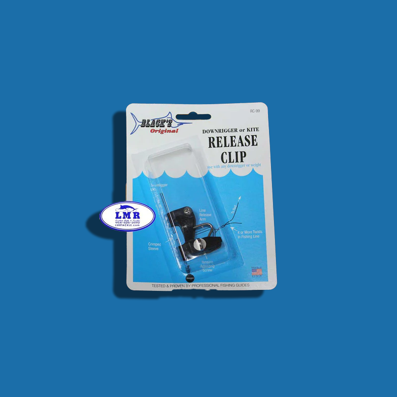 The Black's release clip is the same as their outrigger release clip but without the attaching bar. The clip threads on the downrigger, outrigger, or kite line and is held in position with a crimped sleeve, split shot, barrel swivel, or even a simple knot in the line. Made of stainless steel, nylon, and brass. Add the best kite clip over 30 years.